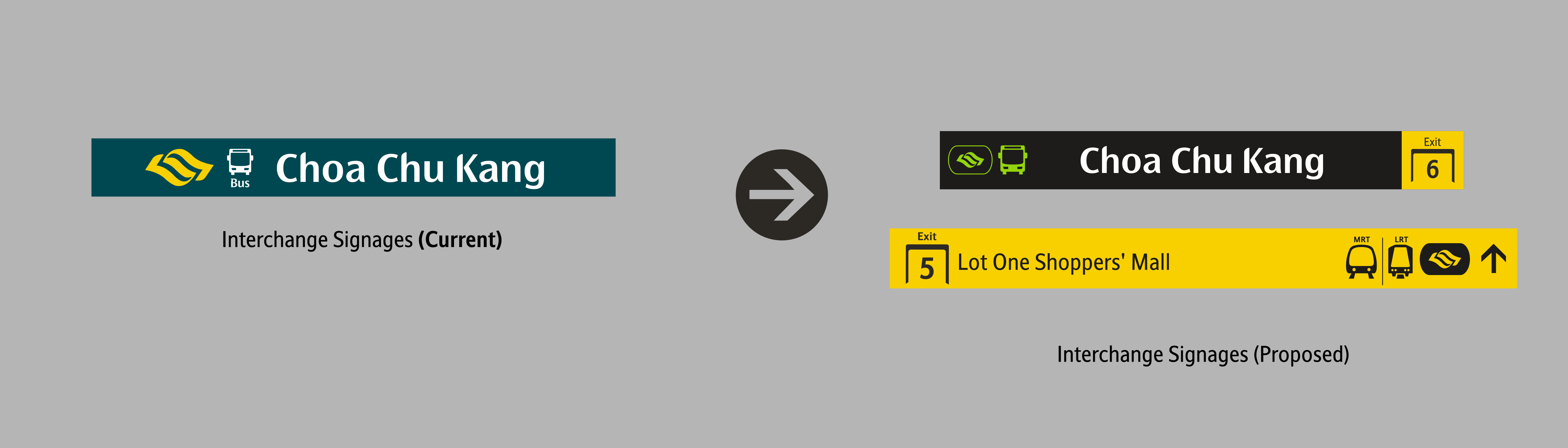 The MRT caplet on the current signage, (the one in blue) might confuse commuters. Usually, a blue coloured caplets meant that the MRT line it is bringing the commuters to, is the Downtown Line. To reduce confusion, I have decided to replace it with the MRT caplets (my redesigned version) shown on Station Entrances.